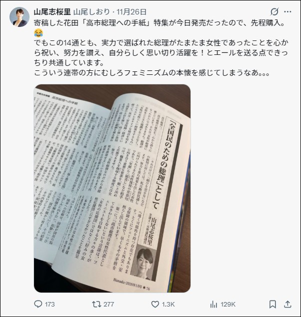 山尾氏が男系ゴリゴリのHanadaに寄稿したことを嬉々としてXにポストしてました。