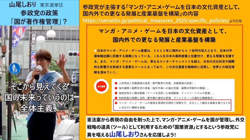 世界で愛されているマンガ・アニメ・ゲームは、日本のおおらかな国柄によって育まれたもの(「おぼっちゃまくん」はその最たる作品の一つですよね)。全体主義・国家主義的な参政党の主張は、作品が生まれる土壌を弱体化させ、潰してしまうものに他なりません。