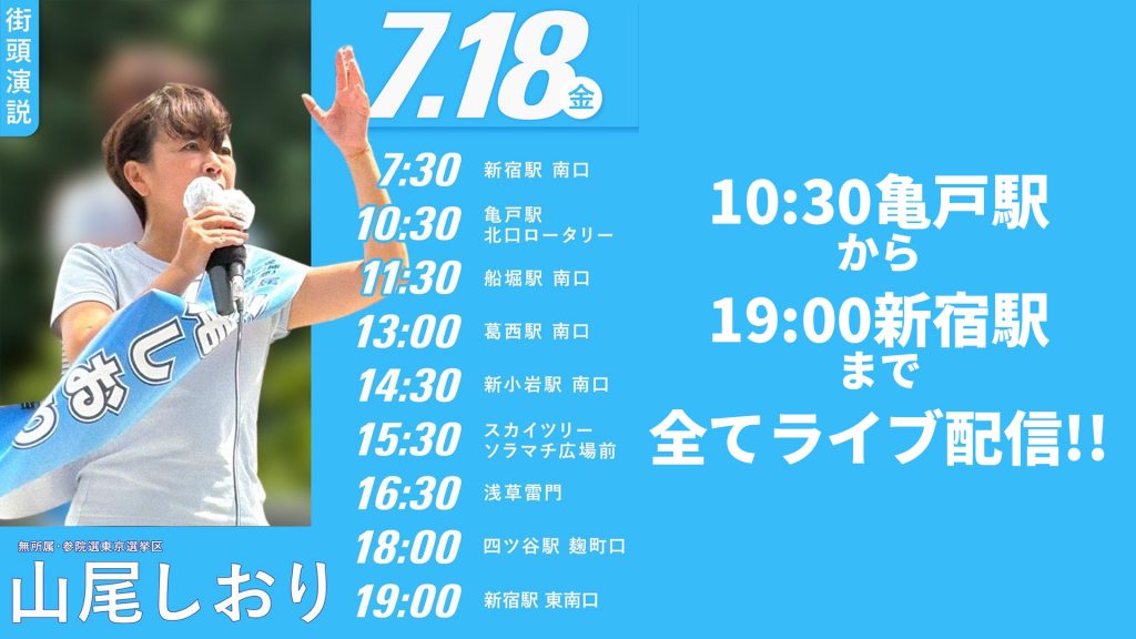 7/18 山尾しおりさん演説予定とライブ配信アドレス