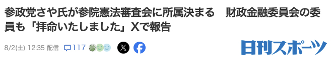 先日の参院選で初当選した参政党のさや議員が「参院憲法審査会」所属になったと報じられています。