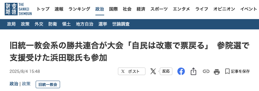 統一協会(世界平和統一家庭連合)には解散命令が出たものの、その政治団体「国際勝共連合」が堂々と決起大会などを開けるんですね。