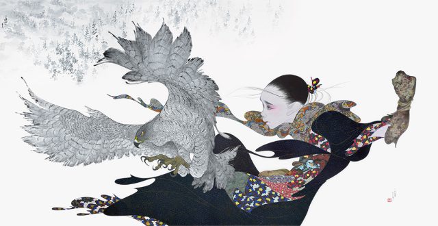 この作品は、静寂の中で鷹と呼吸を合わせて獲物をしとめる女性の「鷹匠」を描いた作品。
