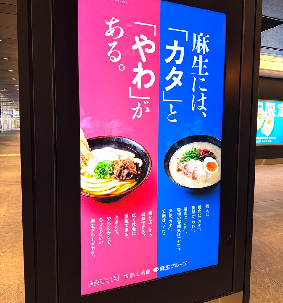硬茹での「バリカタ」があるとんこつラーメンと、「かろのうろん」に代表される柔らかい博多うどんの対比を用いた企業イメージ広告。よく出来ていますよね。「カタくて、やわらかくて、ちょうどいい。麻生グループです。」というコピーなんか、非常に幅広い事業を手掛ける麻生グループの広告として、大変秀逸な仕上がりです。