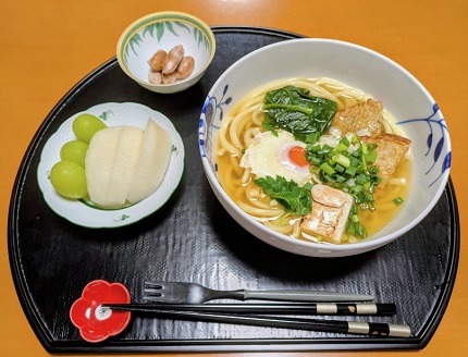 (無塩うどん玉150g·つるむらさき·ネギ·サーモンはんぺん·三つ葉)