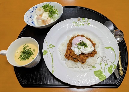 (牛ひき肉·玉ねぎ·ピーマン·パプリカ·人参·レーズン·トマト·卵)