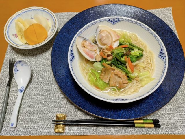 (キャベツ·チンゲン菜·人参·豚肉·蛤·にんにくの芽·椎茸·麺半量)