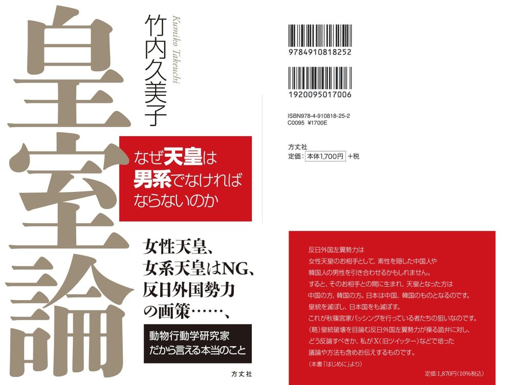 竹内久美子による「皇室論 なぜ天皇は男系でなければならないのか」という本が出版されます。