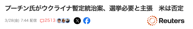 自らの侵略によって選挙ができないような状況に追い込みながら、ゼレンスキーを「任期満了後も戦争を理由に大統領にとどまっていることから、正当な交渉相手ではない」とし、それを理由に暫定統治を「提案」する。