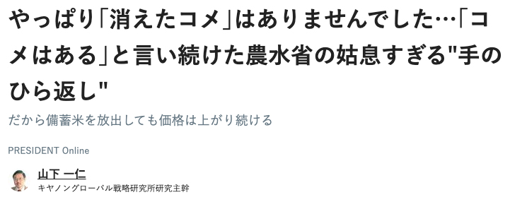 そんな中、プレジデント・オンラインの「やっぱり『消えたコメ』はありませんでした…「コメはある」と言い続けた農水省の姑息すぎる"手のひら返し"」という記事を興味深く読みました。