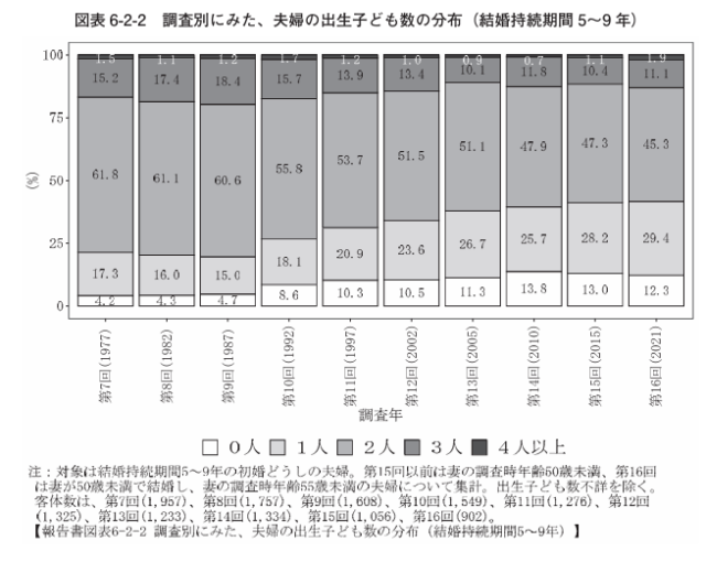 国立社会保障・人口問題研究所が行った、第16回出生動向基本調査で、出生過程の途上にある結婚持続期間5~9年の夫婦の出生子ども数の分布をみると、子ども1人の割合が29.2%となっています。子ども0人の割合は12.3%、出生過程途上の夫婦のほぼ4割が子ども1人、あるいはいないという状況です。2021年の調査ですが、この4年で劇的に少子化が改善された情報はありません。