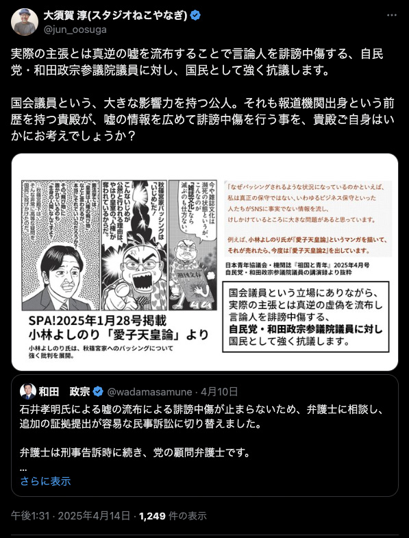 和田議員は別件で、あるジャーナリストに「嘘を流布され誹謗中傷された」と訴訟を準備しているようですが、国会議員である自身は同じ事をしても許されるというお考えなのでしょうか。X投稿の返信待ちです。