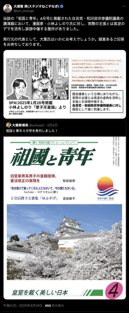 自民党の和田政宗参議院議員が、日本協議会と日本青年協議会の機関誌『祖国と青年』に収録された講演録で語っている嘘は、画像一枚で覆せます。