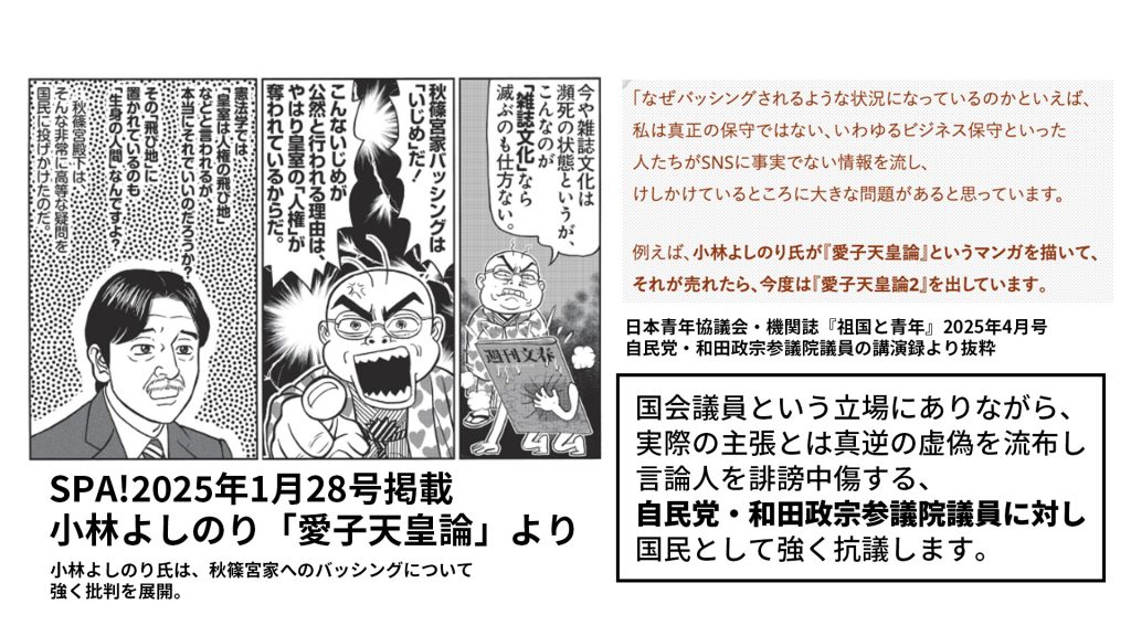 この数コマの引用だけでも、他にこれほどの熱量を持った言論人はなかなかいないレベルで、よしりん先生が秋篠宮家バッシングを強く批判している事がわかります(SPA!2025年1月28日号の「愛子天皇論・257章|皇室は人権の飛び地?」を読めば、前後のコマ・ページでも秋篠宮家バッシングを強く批判している事がわかります)。