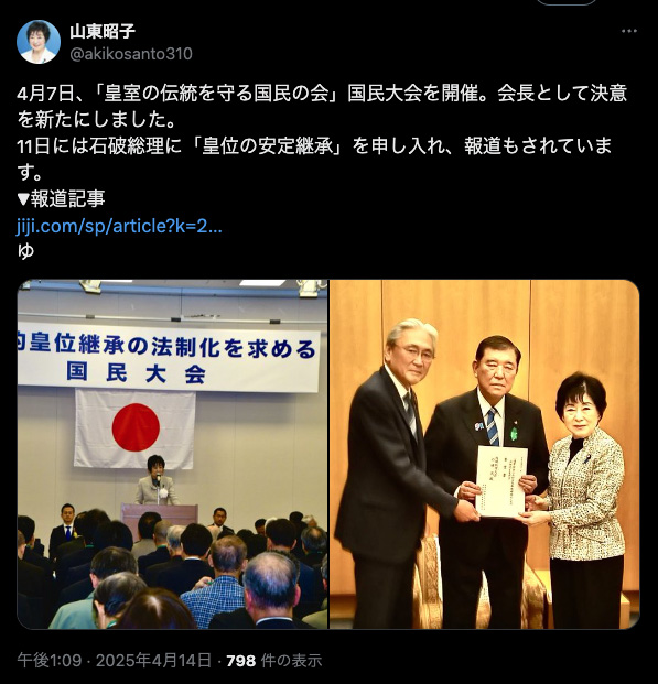 要望書を手渡した阿形吽形の片割れ、自民党・山東昭子参議院議員のXポストにも、同じ時の別カメラからの写真が載っていました。
