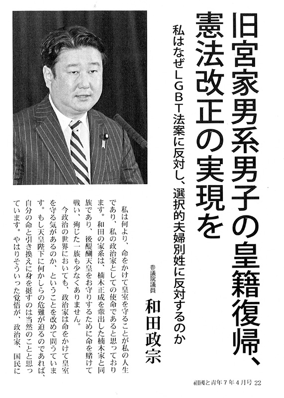 掲載誌である「祖国と青年」の母体である、日本協議会や日本青年協議会といった身内感覚の講演の中で気が緩んで口を滑らせたのでしょうが、和田政宗の言説は常に、多くの国民や、皇室の意識からも遊離した、特定の思想を持つ支持層に向けたものになっています。