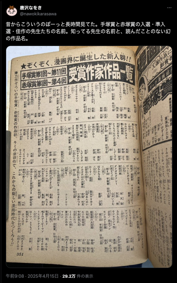 これは、1970年代中期頃の、少年ジャンプ「手塚賞」(ストーリー漫画部門)、「赤塚賞」(ギャグ漫画部門)受賞作家の一覧。唐沢氏の投稿文通り、「おぉっ!?」という作家の名前が随所に見られて大変興味深いですね。