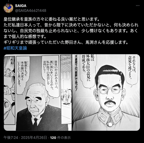 「皇室会議案」においても、SNSでは脊髄反射や論理破綻に溢れたポストばかりが目立ちますが、こんな高い「解像度」と熱意に満ちたポスト、断言しますが他には全くありません。
