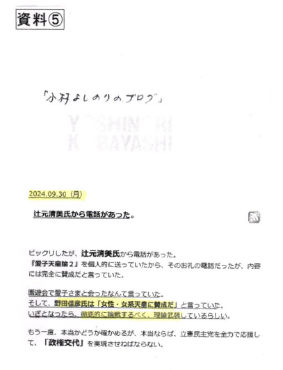 さらに百地は「理由は、野田議員らの目標が『女性宮家創設』と『女性・女系天皇』の実現にあるため?」として「資料⑤」を提示しますが、それが何かと言うと…