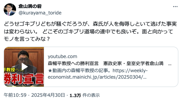 倉山のXのポスト。