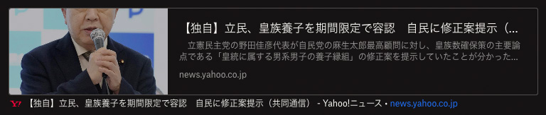 21:00という、だいぶ遅い時間になって「立民、皇族養子を期間限定で容認 自民に修正案提示」というニュースが配信されました。