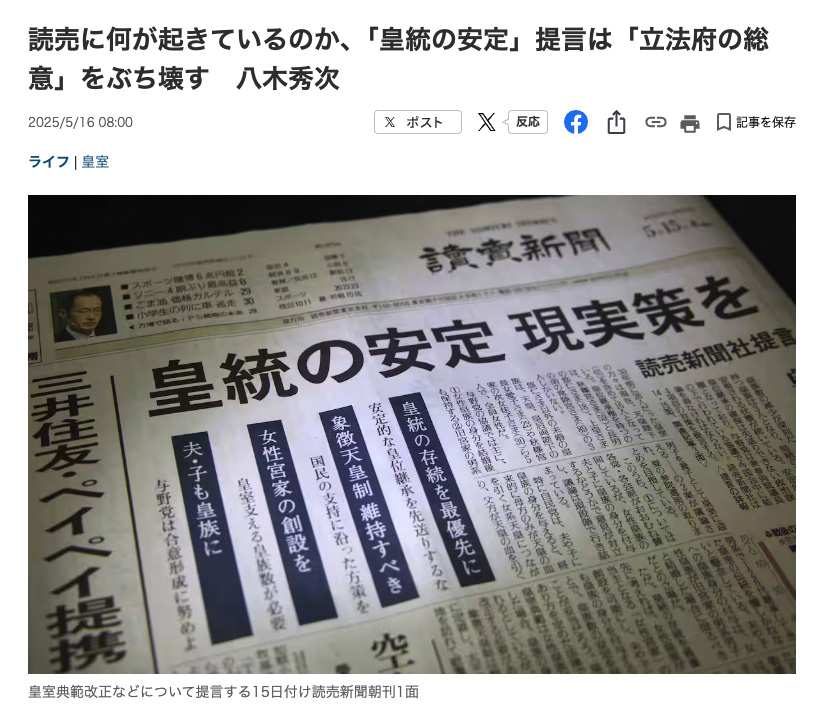 「旧宮家の皇室復帰にケチを付けるための『ためにする』意見に思える」と言うけど、理に外れていると思う事に異を唱えるのは言論の基本中の基本でしょう。それを言えば、「現実策」への真摯な回答がまったくないこの八木原稿なんて、典型的産経読者へのサービスでしかない「ためにする言論の極地」でしかありません。