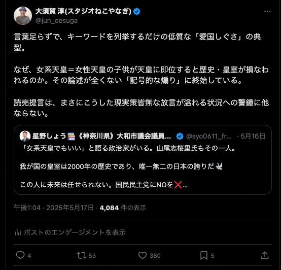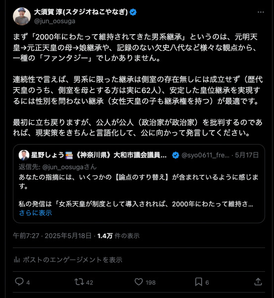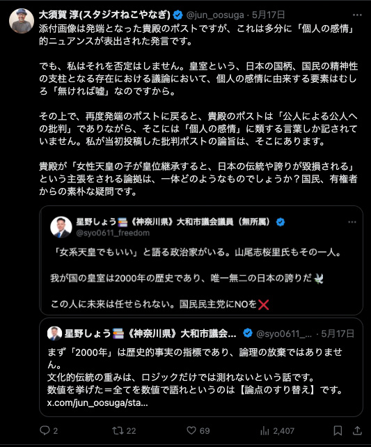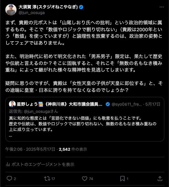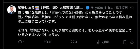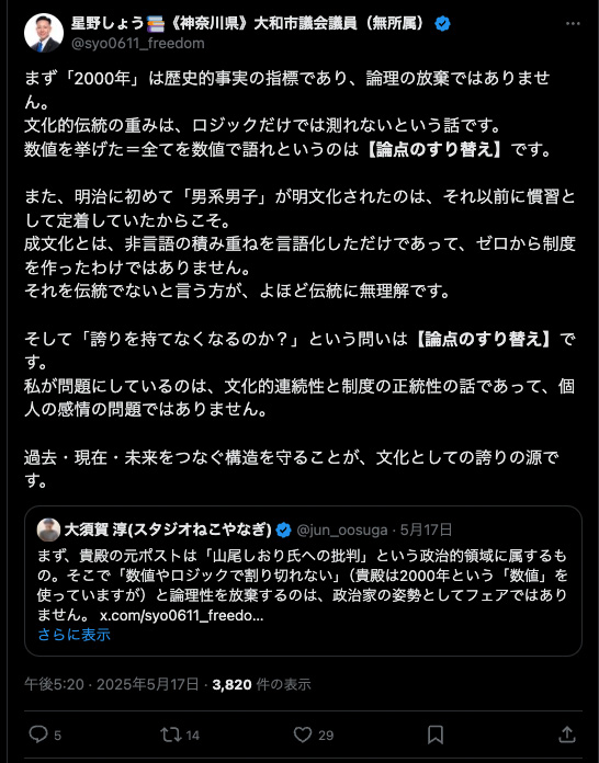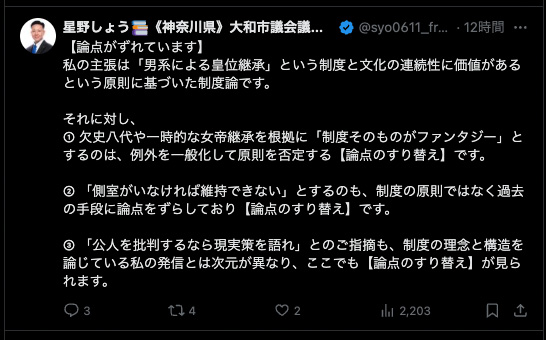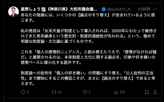 発端は、星野しょう・大和市議会議員による、皇統問題にからめて山尾しおり氏を批判したこちらのポスト。