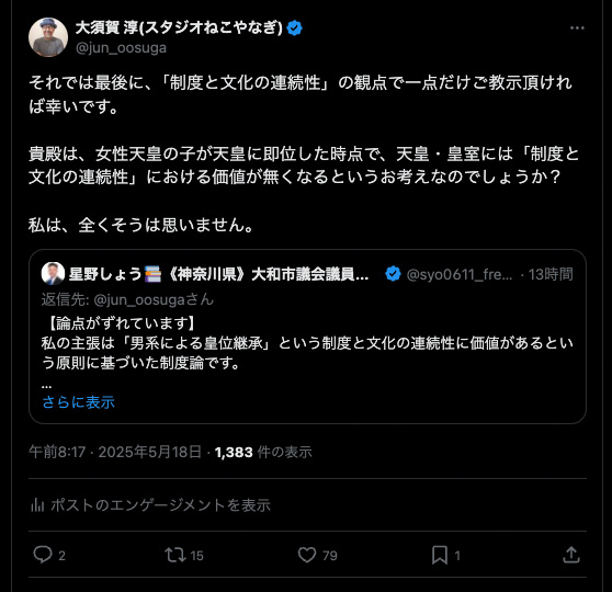 最初のポストの「我が国の皇室は2000年の歴史であり、唯一無二の日本の誇りだ」という一節が「極めて明確な制度論・文化論」に基づいているかは疑問ですが、やはりまた「論点のすり替え」などを主張しごちゃごちゃになって来ました。