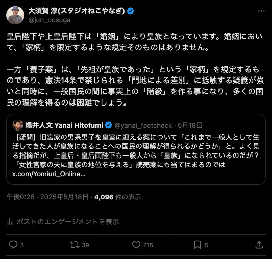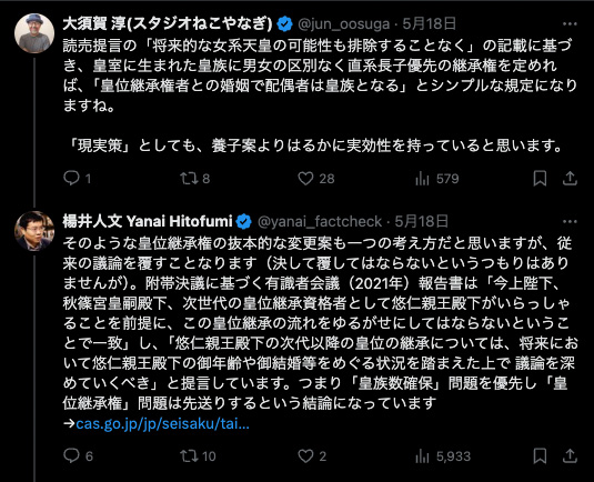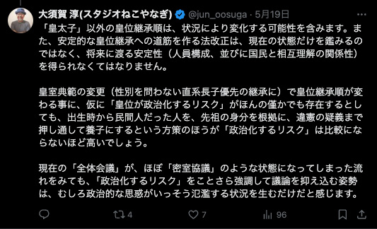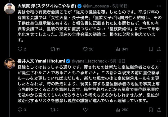 ただ、多くが稚拙な論述と罵詈雑言に塗れた男系固執者とのやり取りとは全く違った、疑問の提示と返答が整然とするX上では珍しい例となったので、記録としてここに掲載しておきます。