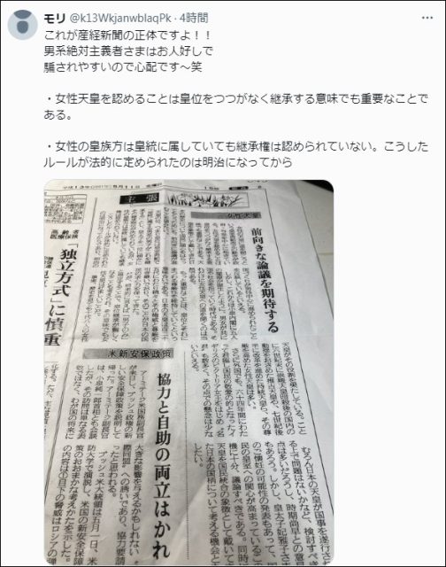 「女性天皇推しだった『産経新聞』の変節」と題して、