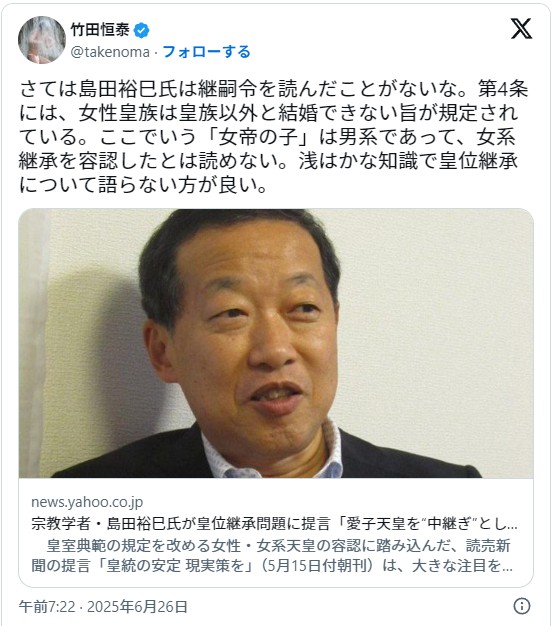 継嗣令の「女帝の子もまた同じ」の規定は、男系派にとっては最大の弱点になるので、連中はありとあらゆる詭弁・曲解・誤魔化し・詐欺的手口を駆使して嘘解釈を浸透させようとしてきますが、絶対に許しちゃいけません!