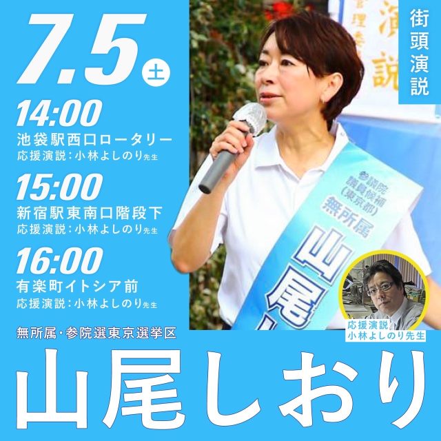 本日、山尾しおりさんの選挙応援のため、よしりん先生が街頭演説に立ちます