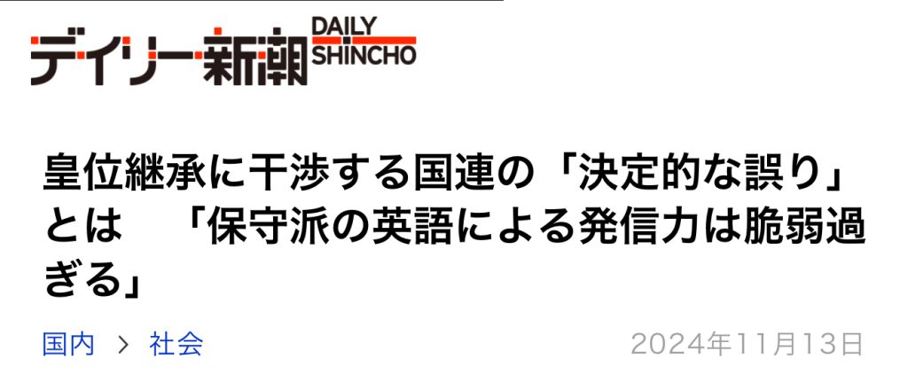 デイリー新潮に、皇位継承について勧告を受けたのは、日本の「保守派」による英語での発信力が脆弱過ぎるからだという趣旨の記事が掲載されました。