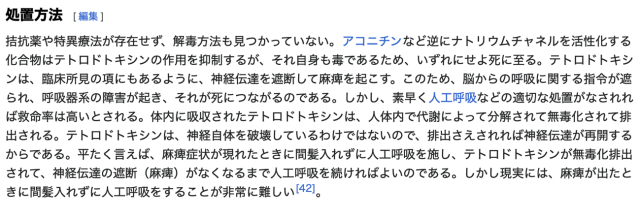 このトリックは河豚毒の特性にありました。河豚毒のテトロドトキシンは神経毒で呼吸困難に陥りますが、最初の呼吸困難を乗り切れば回復する可能性が高い。つまり人里離れたこの病院に到着するまでに死ぬべき人は既に亡くなり、運び込まれた患者はもはや死地を脱しているだけなのに、結果から見るとこの病院に担ぎ込まれた患者ばかりが助かっているように見えるのです※②。