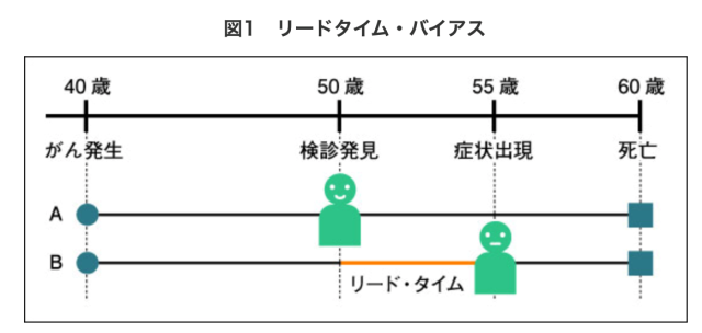 私は医学ではなく、論理の話をしています。人が必ず老いて死ぬ以上、「病気を早く発見出来るようになる」ことは、「発見時点からの生存率は上がる」ことと同じ意味であって、これは「早く寝れば長く眠れる」と言うがごとく、当然の理路に過ぎません。「10年生存率の上昇」と聞けば寿命が延びるように思えますがそれは錯覚で、これがリードタイムバイアスのからくりです※①。