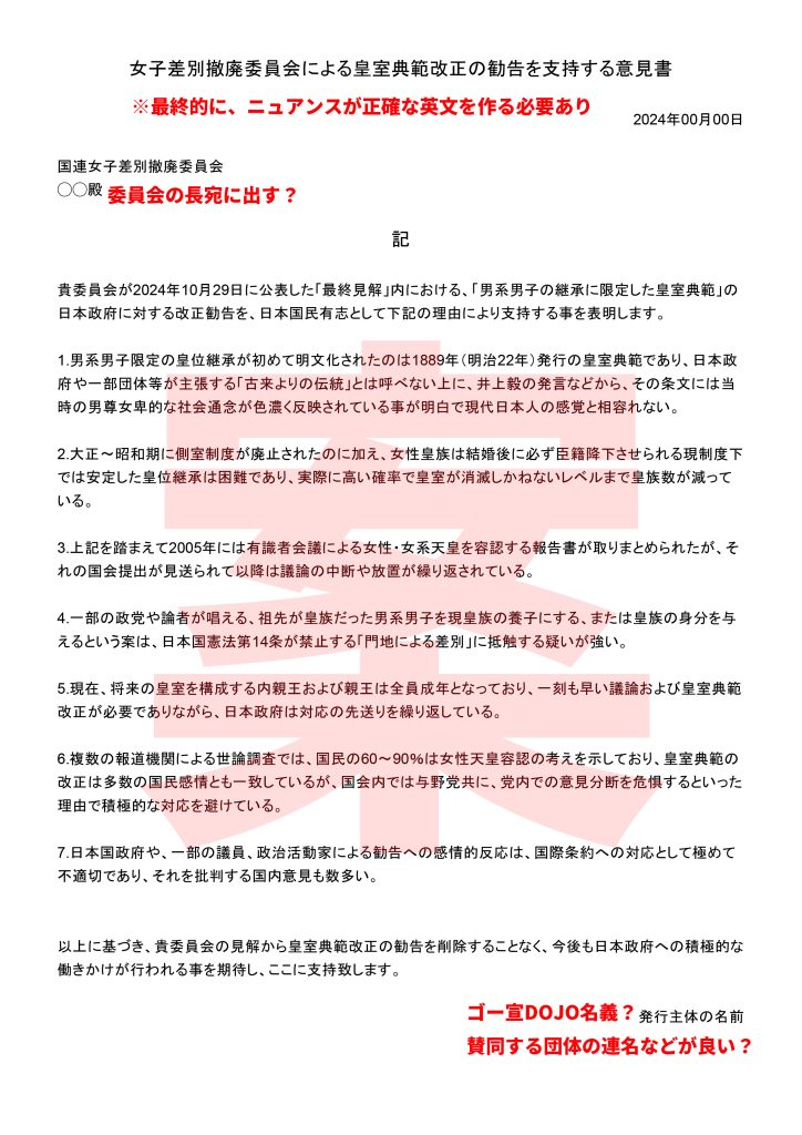 昨日のブログで、女子差別撤廃委員会からの皇室典範改正勧告を支持する意見書を国連に提出するのはどうか?という案を述べましたが、とりあえず「例えばこんな感じ」という文面を試作してみました。