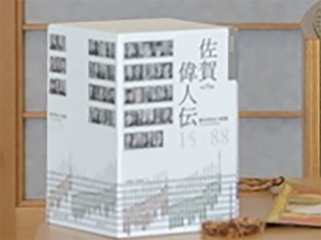 その、同じ室内の別ショットには、テーブル上の和紙の傍らに「佐賀偉人伝」という本も置かれています。