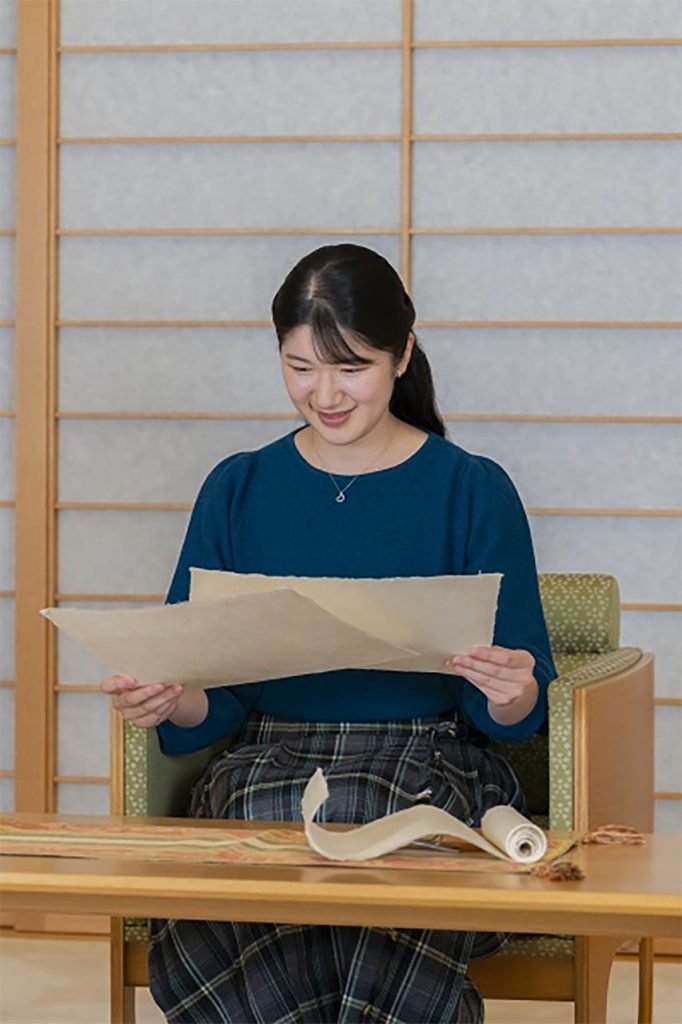 全4枚の写真のうち、1枚は初めてとなる単独でのご公務で訪問された佐賀で自ら漉かれた和紙を見つめるお姿。