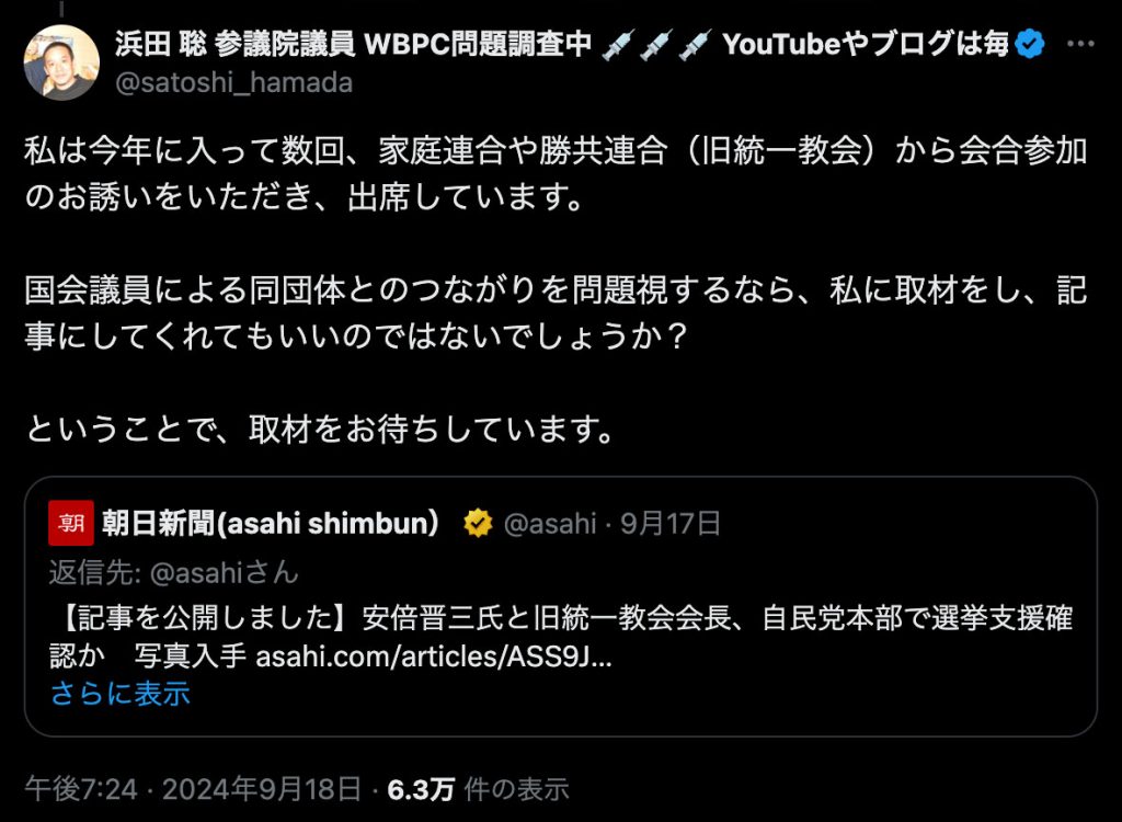 浜田聡・参議院議員(NHKから国民を守る党)「最近私、旧統一協会、家庭連合の方と意見交換をさせて頂いております。今後、色々とあると思いますけど、私自身現職国会議員としてやはり意見を聞く事は大事だと考えておりますので、ご報告させて頂きます。」