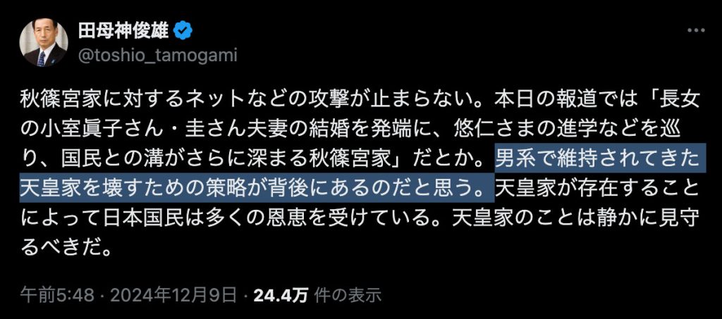 田母神ポストも、男系男子絶対という自らが帰依するイデオロギーの死守しか念頭にないので、皇族への慮りではなく、安っぽい陰謀論みたいな言葉になっています。