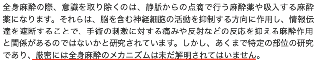 前回「手術成功、患者死亡」で紹介した記事を再度引用しますが、「麻酔から覚めない」という最初の小見出しは衝撃です。そもそも「全身麻酔のメカニズムは未だ解明されていない」そうで、私たちは機序すらよく分かっていない全身麻酔で手術を受けているのです※①②。