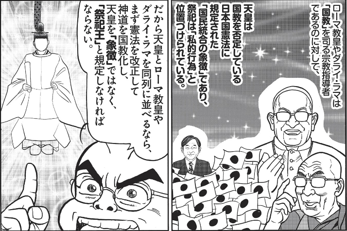 「皇統(父系男系)を守る国民連合の会」の葛城奈海が女子差別撤廃委員会の席上で喧伝し、男系固執の政治家なども用いる「天皇は祭祀王」「「世界にはさまざまな民族や信仰があり、それぞれ尊重されるべき」という主張は、SPA!2024年12月14日号掲載のゴー宣・愛子天皇論254章でも喝破されている通り、神道を日本の国教とした上でないと成立しません。