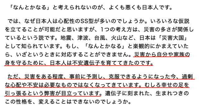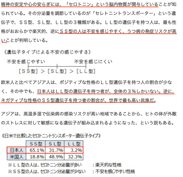 日本人が不安を抱きやすい民族である原因は、セロトニンの分泌量が少ない遺伝子的性質にあるとされています。日本人がヘタレな理由が本当に遺伝要因にあるならば、それは知識や努力や根性の問題ではなく、いくらワクチンやマスクが逆効果だと説明しても、何を言っても無駄という事になります。しかしいくら無駄とは言え、これらの気質が鬱や自殺につながるのですから何らかの対策が求められます。「不安」は日本人の国民病なのです※①②③④。