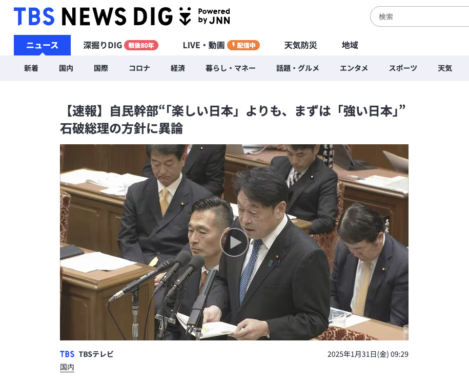 国会の冒頭で石破首相が述べた「楽しい日本」というキーワードに対して、自民党内から「まず作り上げるべきは〝強い日本〟」だという異論が出ているそうです。