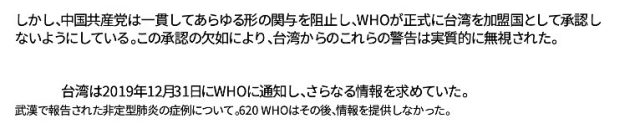 総括文書※②には「WHOは使命を果たせず、中国共産党の圧力に屈した」として、2019年12月に台湾からの感染者急増の警告を無視したという重要な指摘が載っています※③。WHOは台湾の警告を無視し、中国の意向に沿う形で2020年1月14日「中国当局の予備調査では新型コロナウイルスのヒトからヒトへの感染の明確な証拠は見つからなかった」とツイート。そしてCOVID-19をパンデミックと定義することを延期し、この見解を覆すのに1ヶ月かかっています。当時のトランプ大統領は2020年1月31日に中国からの渡航を禁止しましたが、WHOの中国への忖度がこの一ヶ月の空白に繋がったと報告書は批判しています。