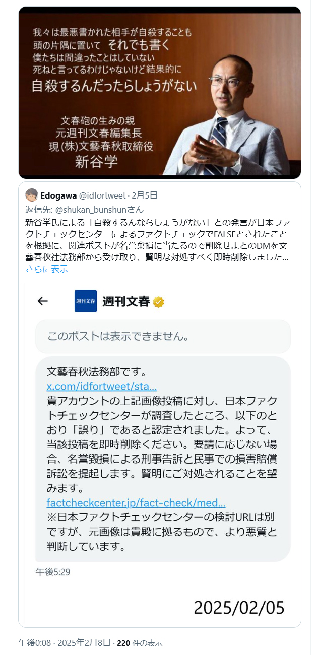 中居くんを擁護する人々が、「週刊文春」への怒りを抱いて、過去の発言を拡散しているものだが、なんと、この投稿を拡散しているSNSユーザーに対して、文藝春秋法務部が、削除しないと刑事告訴と損害賠償訴訟を起こすという文章を送り付けていたらしい!