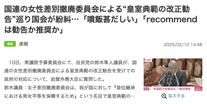 女性差別撤廃委員会からの「recommend」が「国体の変革を図ろうとする企て」だということは、鈴木議員は「女性が皇位継承できるようになる事は、国体の変革である」というお考えなのでしょうか?
