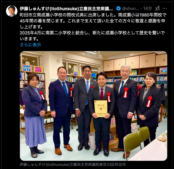 私は伊藤議員の地元に近い地域で2人の子供を育ててきましたが(現在、大学生と中3)、実はうちの子らが通っていた小学校も、南成瀬小学校と同じぐらいの年代に開校。今のところ統廃合の話は出ていない模様ですが、うちの子らが通っていた時でも、1クラスの人数が大幅に減った上で、かなりの教室が空き部屋になっているような状況でした。