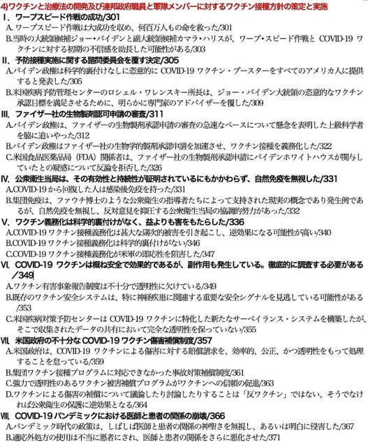 この総括文書はトランプの選挙勝利後の2024年12月にまとまったもので、「トランプは善、バイデンは悪」というプロパガンダの性格を持ちます※①。よってこのワクチン施策のパートについては、そのバイアスを考慮した上で目次から慎重に読み解いていきます※②。