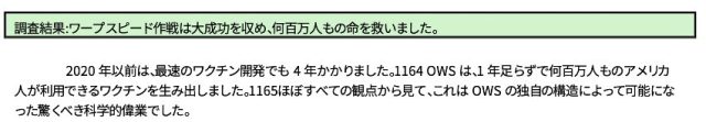 まずⅠではトランプ政権時代に決めた迅速なワクチン開発体制が大成功とありますが※③、これは当然首を傾げるべき見解で、長期的影響が不明な製剤を短期間で承認したことが未曾有の薬害に繋がっているわけです。しかも後段でバイデン政権の介入で承認が早められたことを咎めていますから※④、まるで論理が矛盾しています。