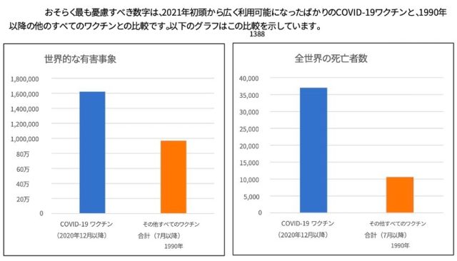 そしてⅥは「コロナワクチンは概ね安全で効果的」とありますが、報告書では「安全で効果的」な根拠は示されず、あくまでもワクチンを義務化したことが問題で※⑧、有害事象は徹底的に調べられるべきと主張しています。このワクチンでの有害事象が、過去30年の全ワクチンを凌駕する事実もグラフ付きで紹介され、報告システムと補償制度の充実が必要だと結論づけられます※⑨。